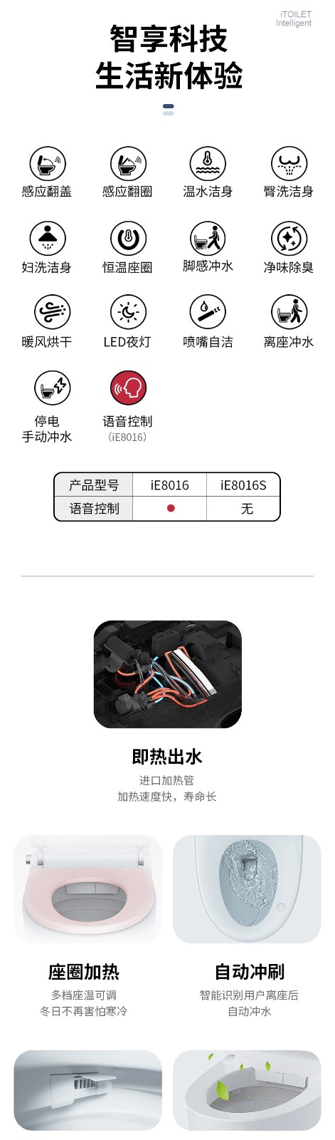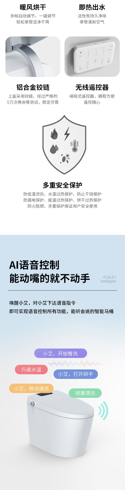 3、主要功能:AI語(yǔ)音控制(可選)、著座感應(yīng)、腳感翻蓋/翻圈/沖刷(可選)、停電(接USB)沖刷、暖風(fēng)烘干、無(wú)線遙控、凈味除臭、