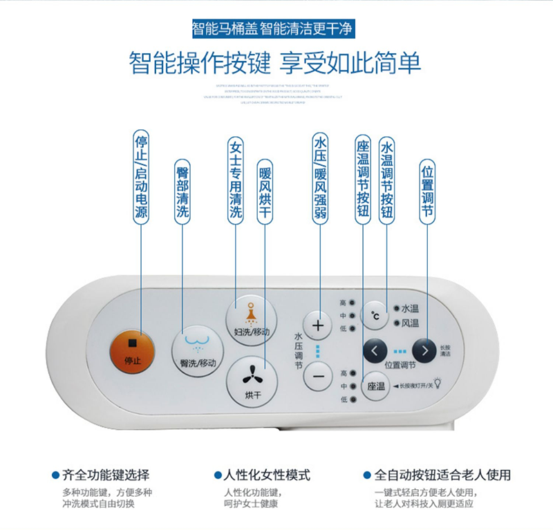6、 女性洗凈:專為女性日常衛(wèi)生而設計,由女性專用噴嘴噴出溫水,精心清洗,防止細菌感染;